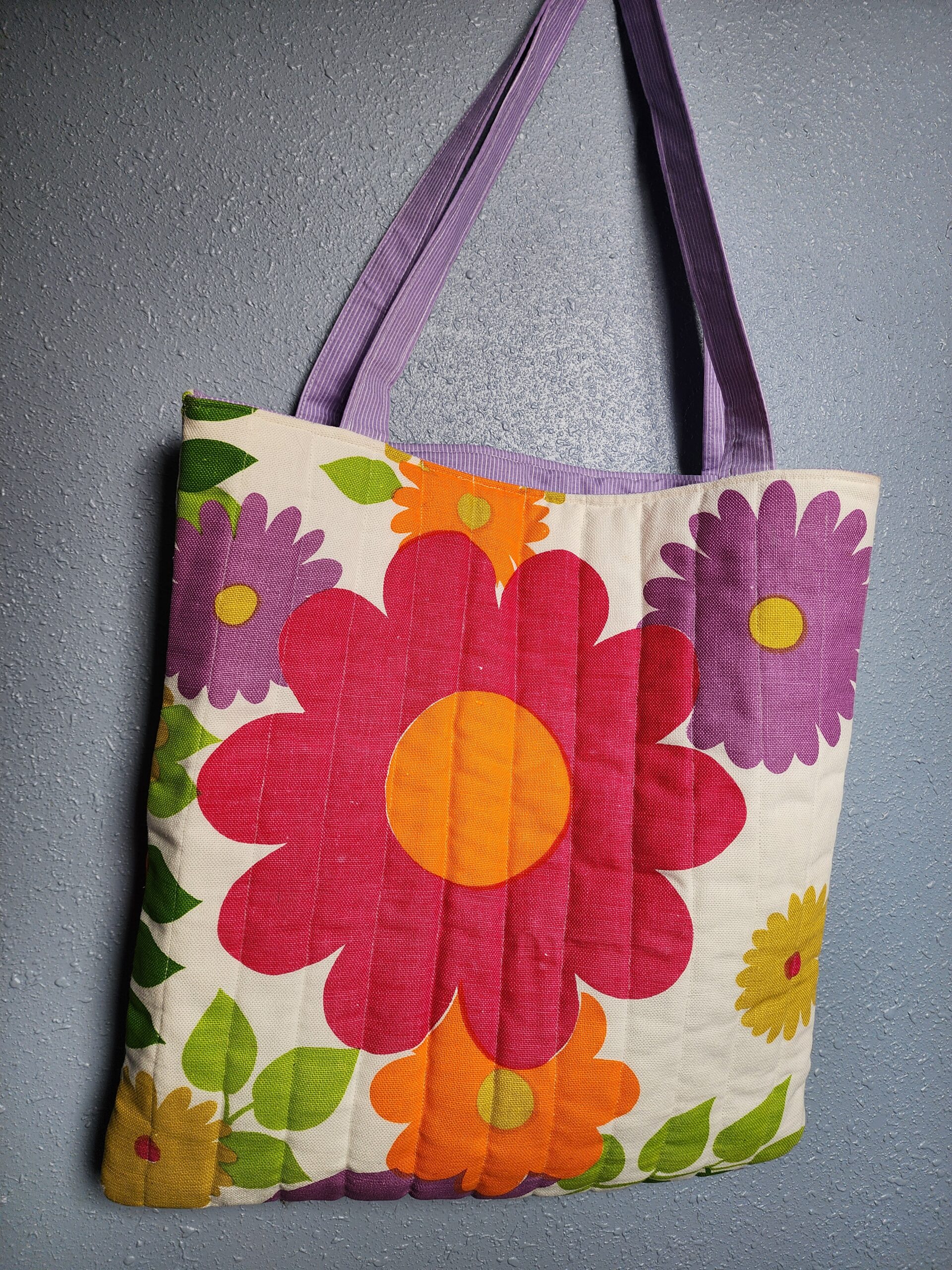 This is a very fun and unique tote bag upcycled from what has to be a 1970's bedspread complete with the little ball fringe all around it. This is definitely for a fun-loving person. This is a large, heavy-duty quilted bag with large colorful flowers and vines and leaves all over it on both sides. The back of the bag has a large pocket trimmed out with the little ball fringe. The inside is lined with a light purple cotton and also has a large pocket on the inside as well. This is a one-of-a-kind bag that all your fun friends would love.