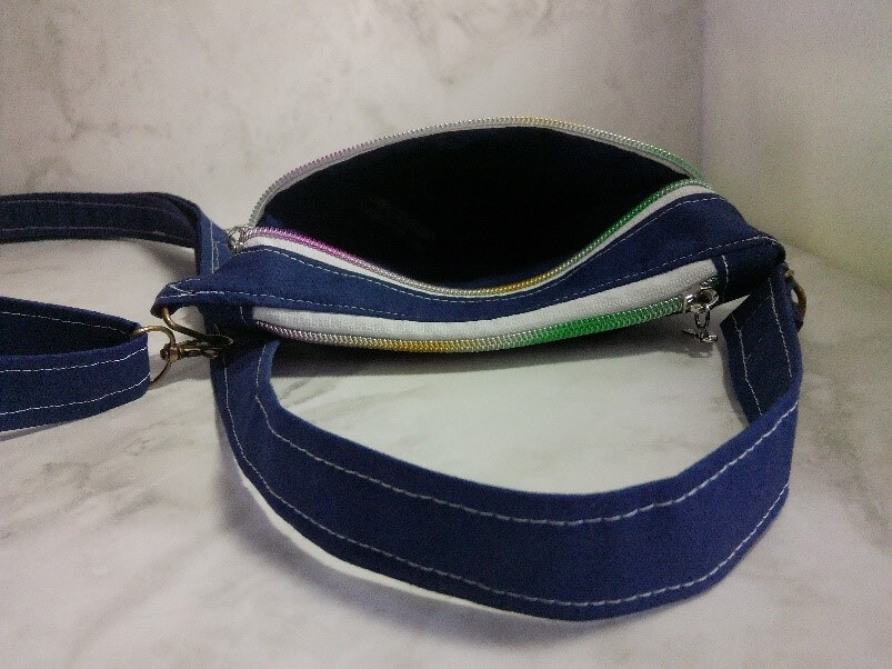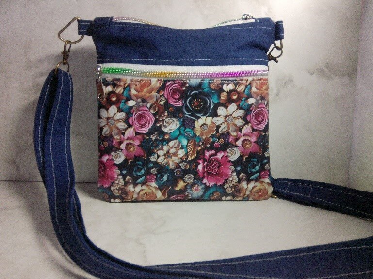 This is a crossbody bag called The Zippy pattern by Sallie Tomato. This purse is 7 ¾ inches wide, 8 inches tall and has an adjustable strap of about 75 inches so you can literally make it any size you want. The front has cotton fabric on the top vinyl on the bottom. There are 2 zipper pockets on the front, one on the top and one on the back. These pockets are fully functionable. This is a small bag for a little day trip or a young girl. Fully handmade.