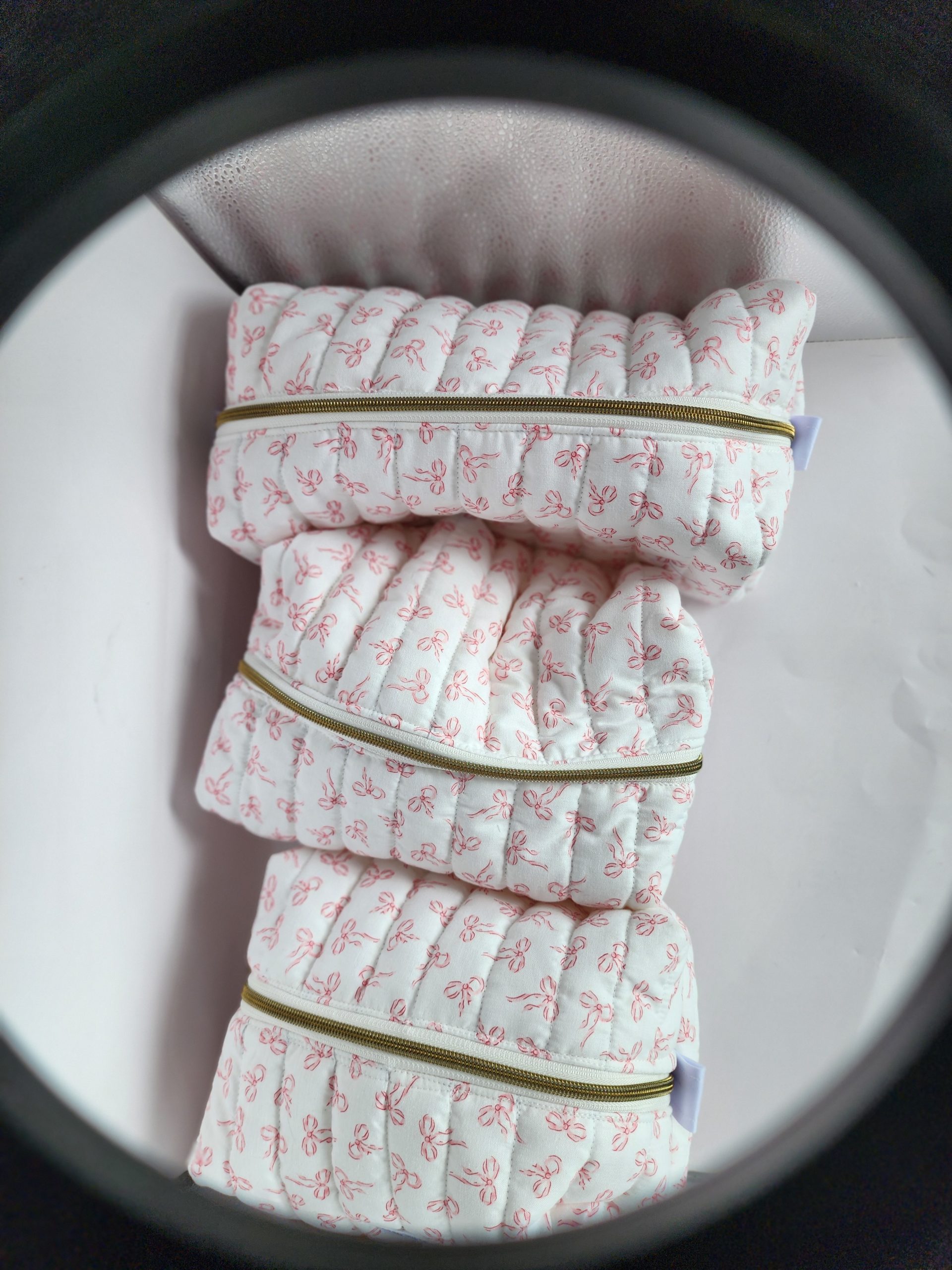 This is my medium makeup or whatnot bag. It is quilted with a white lining. All seams are finished so there are no open seams inside the bag. The bag is 10 inches long, 7 inches wide, and 5 inches high. It has plenty of room for whatever you want to use it for, makeup, charging cords for travel or snacks for a day outing. re Perfect for anything you need a small bag for. This also comes in 3 sizes, this one is the medium, there is a small which is 8 inches long, 7 inches wide and 5 inches high. There is also a large bag that is 12 inches long, 8 inches wide and 7 inches high.