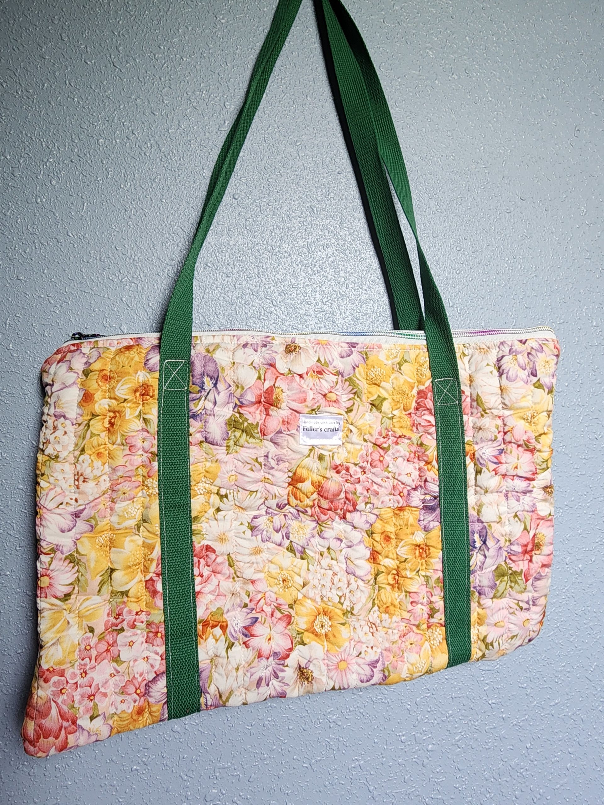 These quilted computer and iPad bags come in many fun color combinations. You can match them or go with completely different colors.  This one is a multicolored floral cotton with green straps, that are 56 inches long and extend the full length of the bag for added support.  The inside is a hunter green lining with a multicolored floral pocket that is 11 x 7 1/2 inches.  The computer bag is 17 1/2 inches wide, 12 1/2 inches tall and about an inch thick.  The iPad bag is 12 1/2 inches wide and 13 1/2 inches tall and has an inside pocket that is multicolored floral like the outside of the bag and is 9 1/2 inches wide and 6 inches tall.  The iPad bag has pink satin straps that are 45 inches long and also extend the full length of the bag.  These are just in time for the new school year