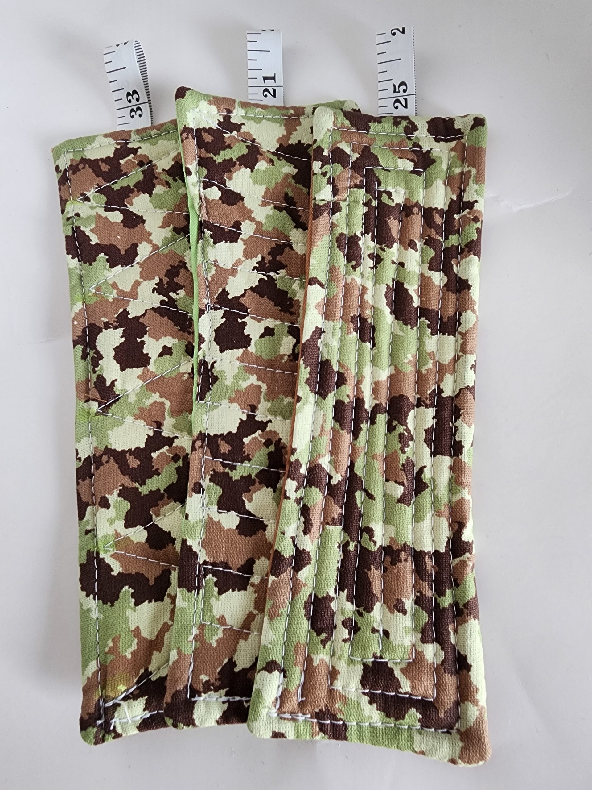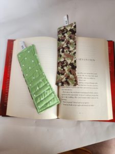 This is like your typical bookmark except it is fun fabric that is quilted.  These are all quilted in different stitching patterns.  They are 7 1/2-inches long, 8 1/2 inches long counting the top ribbon, which is made out of a tape measure, and they are 2 1/2 inches wide.  These are light and handy to just throw in your purse or book sleeve and never lose your place again.  They also make a great little gift to throw in with a card or a letter.  You can never have enough bookmarks.