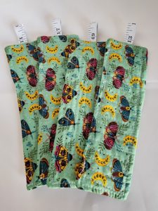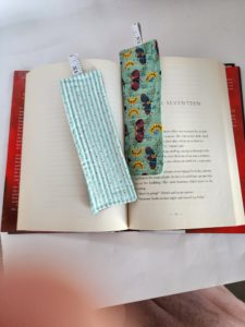 This is like your typical bookmark except it is fun fabric that is quilted.  These are all quilted in different stitching patterns.  They are 7 1/2-inches long, 8 1/2 inches long counting the top ribbon, which is made out of a tape measure, and they are 2 1/2 inches wide.  These are light and handy to just throw in your purse or book sleeve and never lose your place again.  They also make a great little gift to throw in with a card or a letter.  You can never have enough bookmarks.