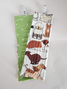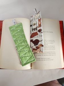This is like your typical bookmark except it is fun fabric that is quilted. These are all quilted in different stitching patterns. They are 7 1/2-inches long, 8 1/2 inches long counting the top ribbon, which is made out of a tape measure, and they are 2 1/2 inches wide. These are light and handy to just throw in your purse or book sleeve and never lose your place again. They also make a great little gift to throw in with a card or a letter. You can never have enough bookmarks.