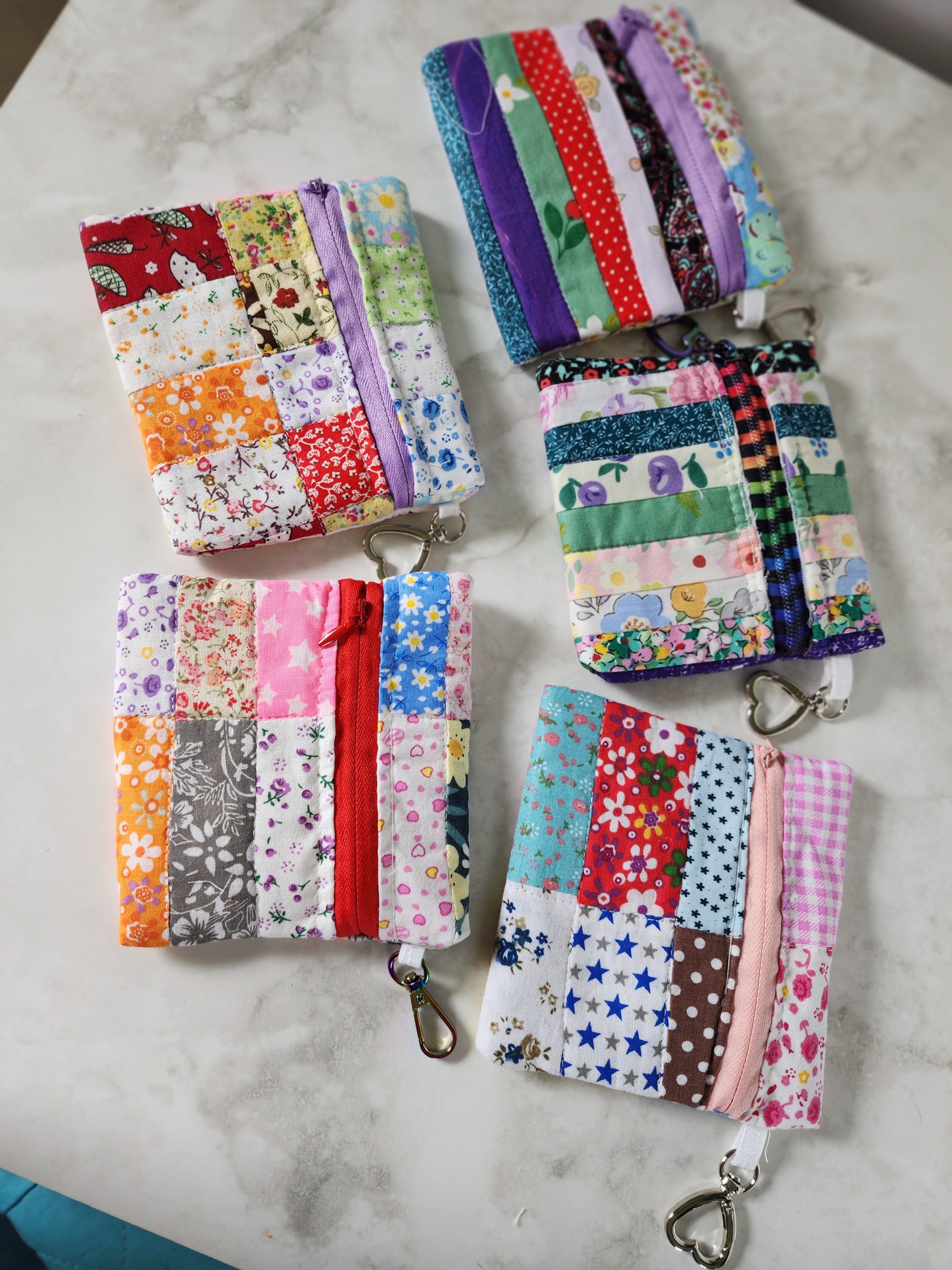 Who says quilting is just for blankets? Here are some cute little wristlet wallets that are made and quilted from scraps of material. They are all different in their own way. They all have different linings, and they all have a zipper approximately 1 inch from the top on the front. They all have a clip on the right side so you can hook them on your bracelet, belt loop or anything else. They are the perfect size for credit cards or cash or maybe a lip balm when you don't want to carry a big purse or wallet. They are all approximately 5 inches wide and 4 inches tall.